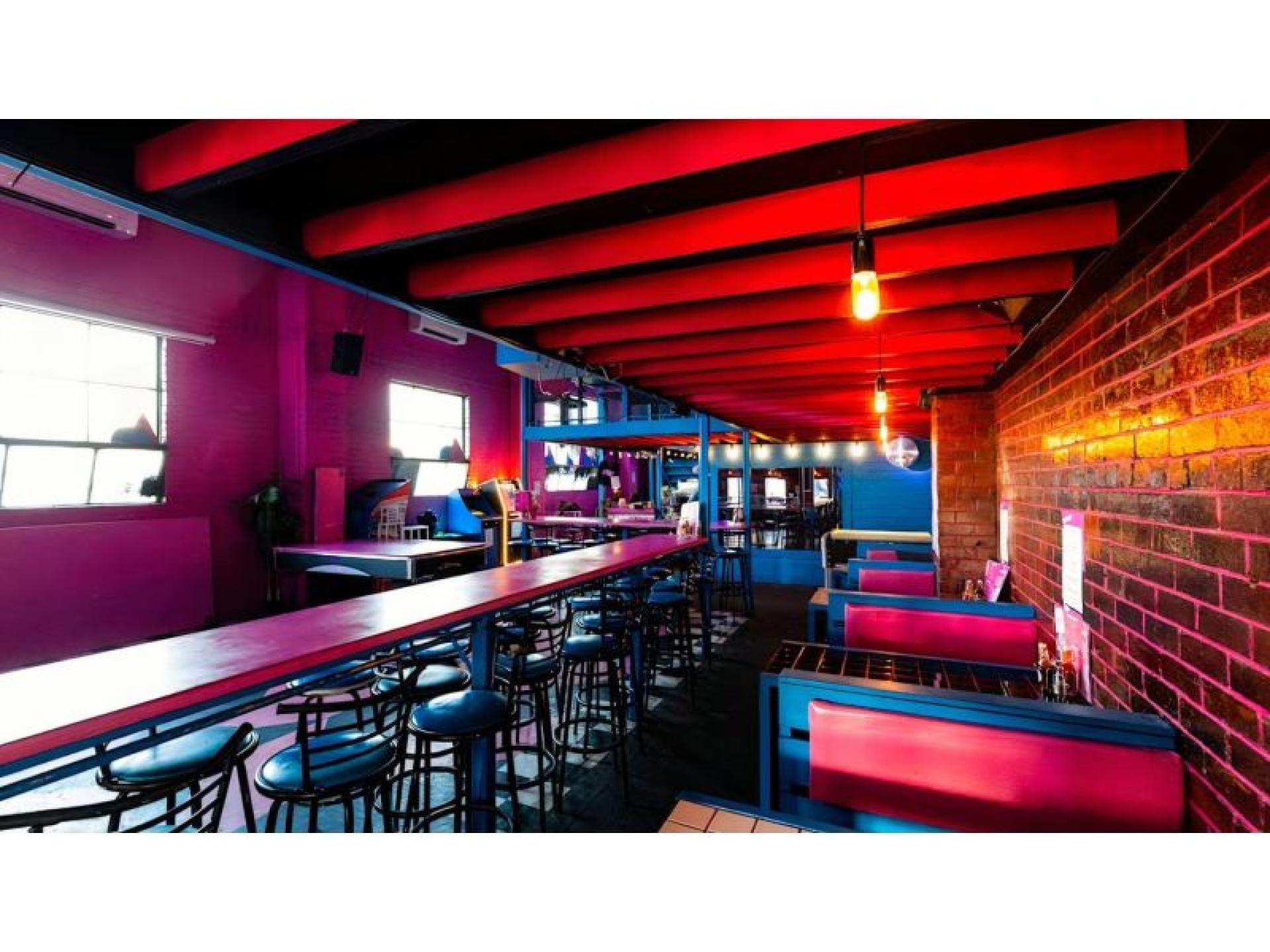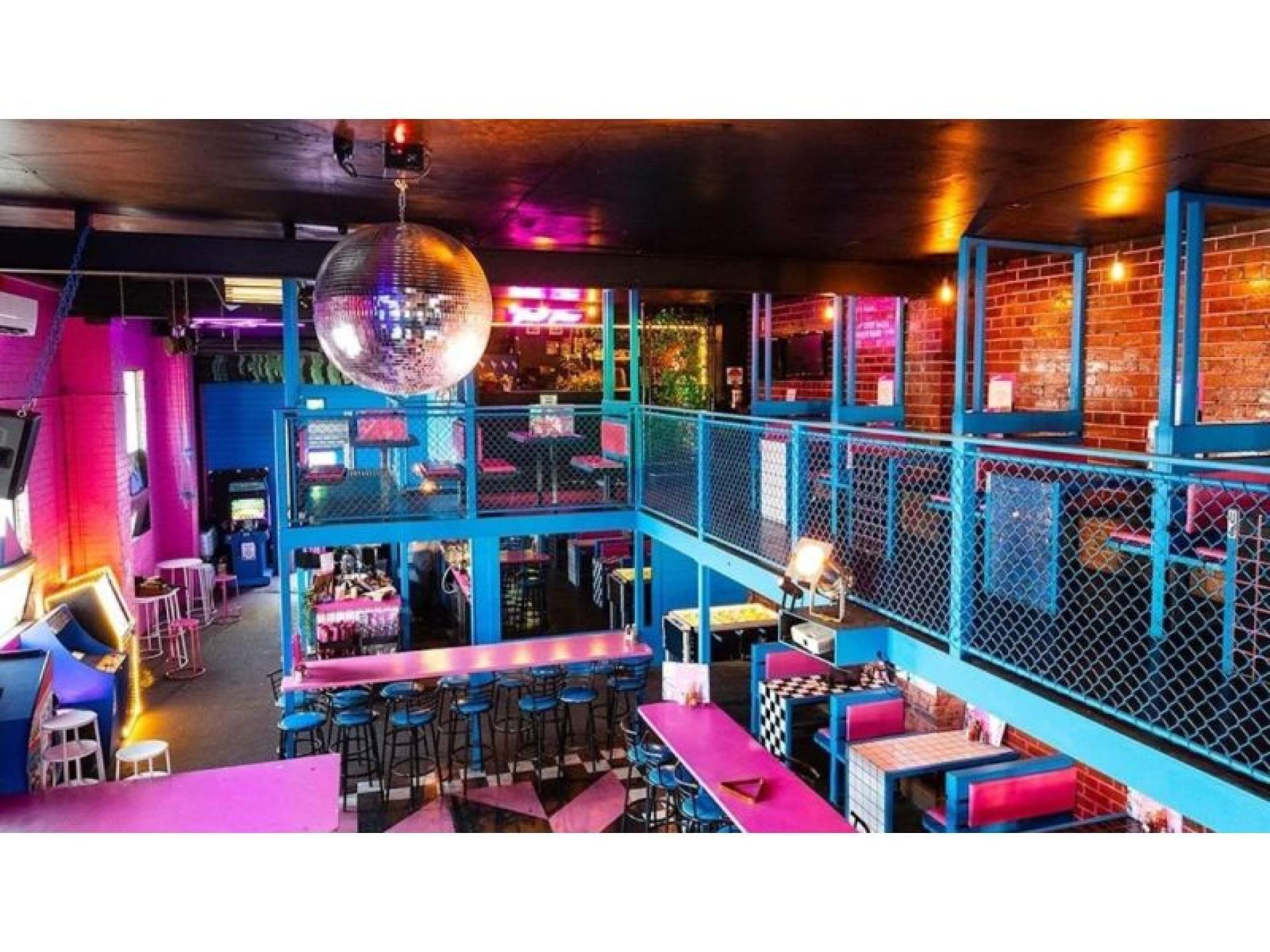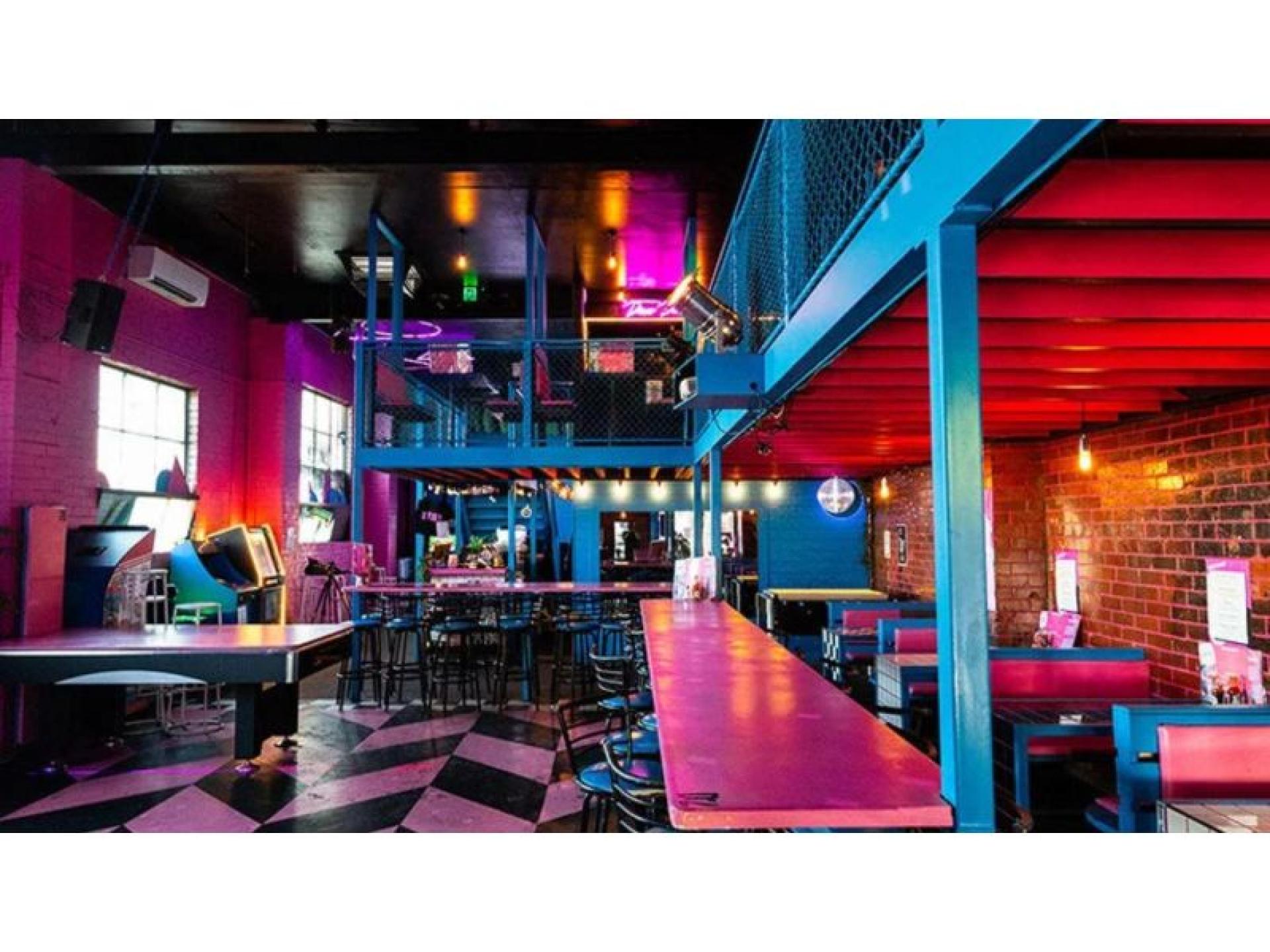 The prominent corner site is instantly recognisable, with the interior and exterior drenched in classic 80s bubblegum pink and cobalt blue. Footpath trading is available at the front of the venue, adding to its street presence and casual dining appeal. Inside, booth seating lines the walls surrounding a central dance floor, creating a flexible layout suited to both dining and late-night trade. Multiple retro arcade games (set to free play) and a pool table enhance the venue's entertainment offering. The main bar is positioned at the rear and leads through to a fully equipped commercial kitchen. Upstairs, a mezzanine level provides additional booth seating around the perimeter, along with a secondary bar, storeroom and walk-in cool room. A rear courtyard connects to the amenities and offers further operational flexibility.
