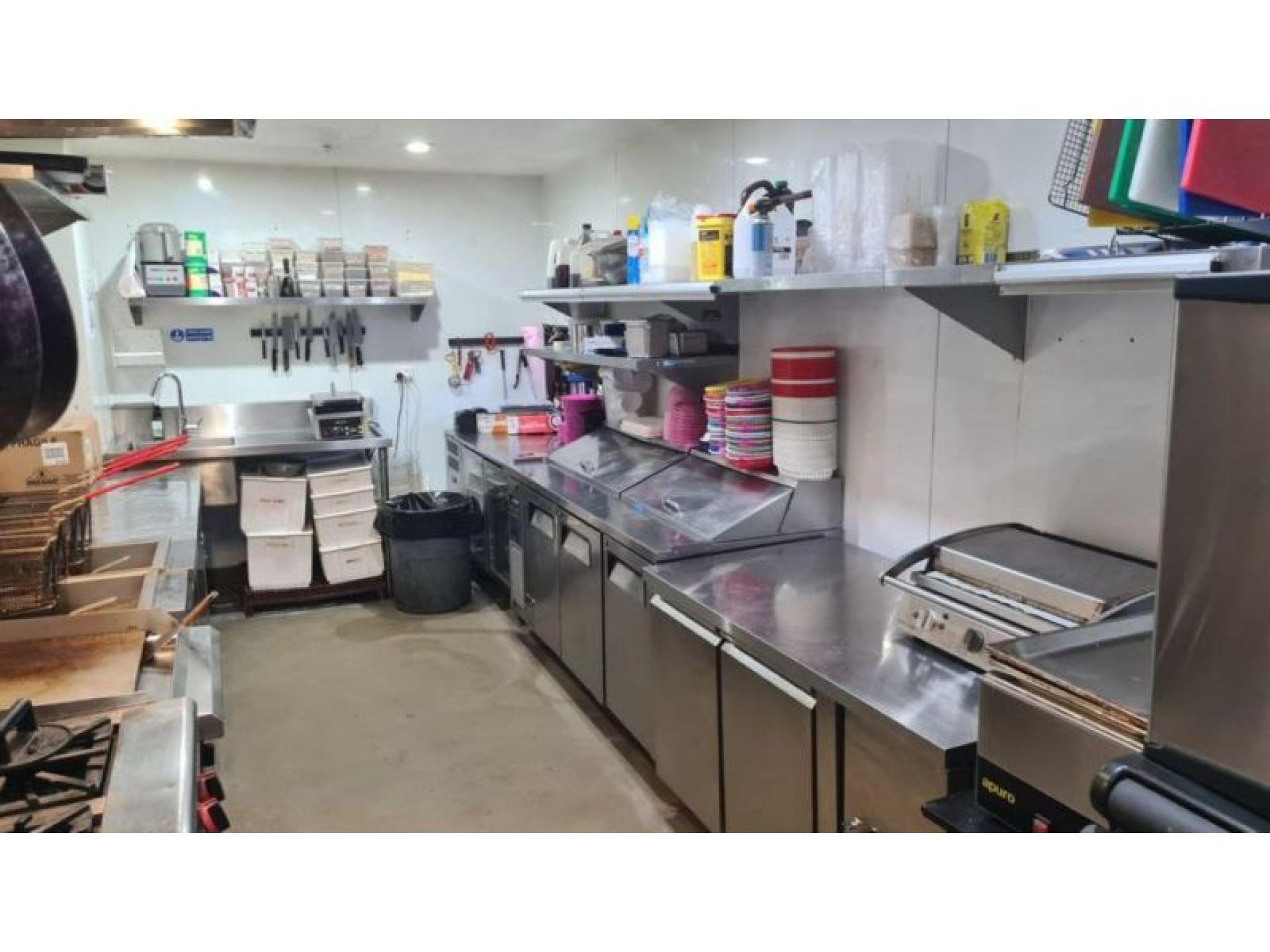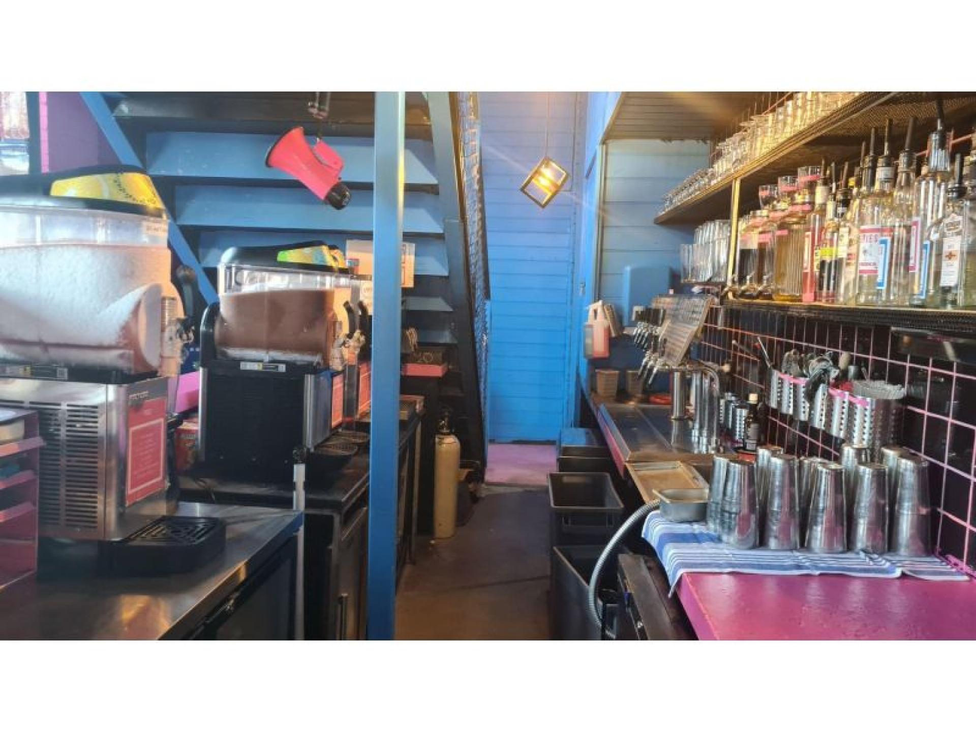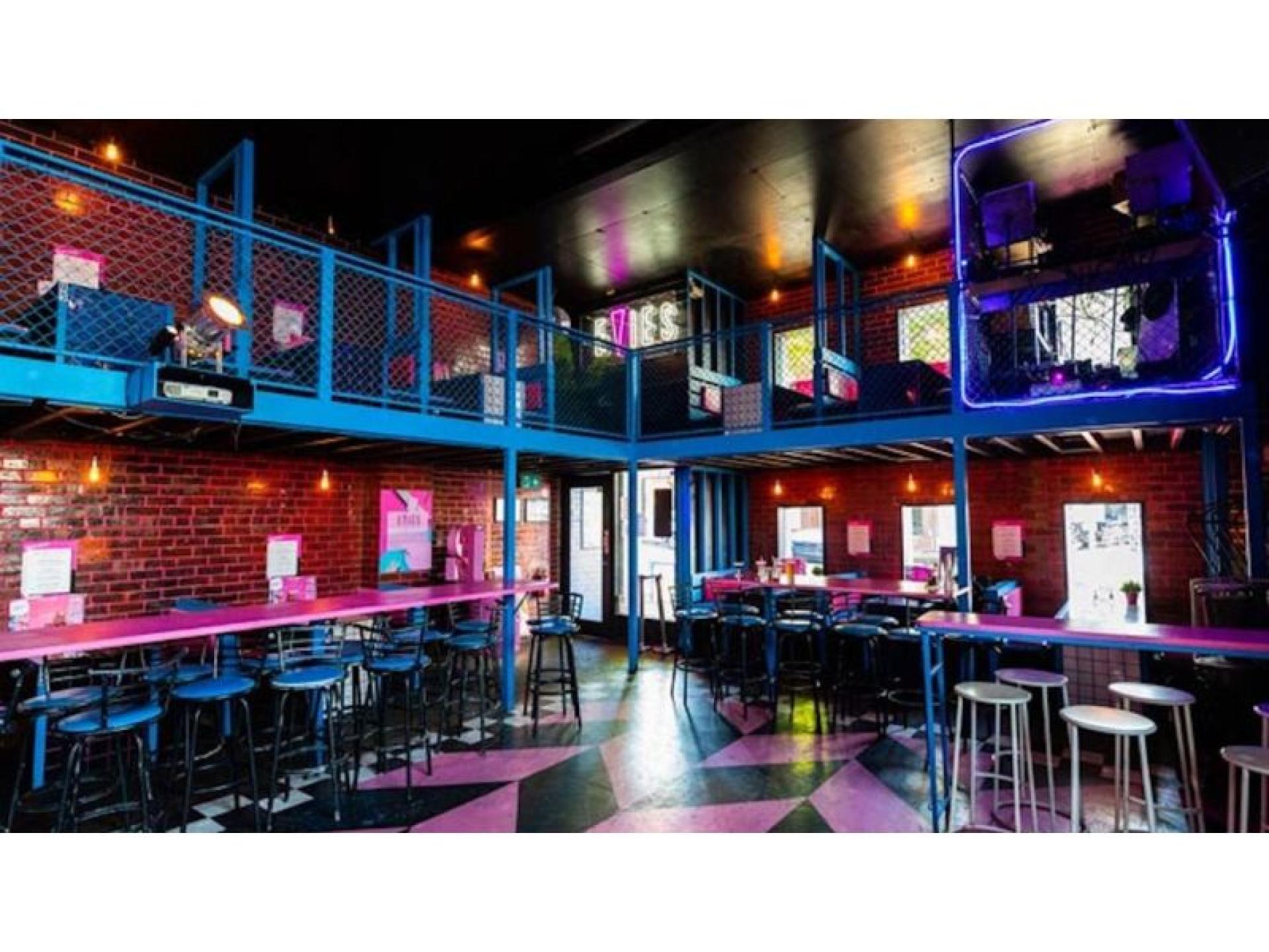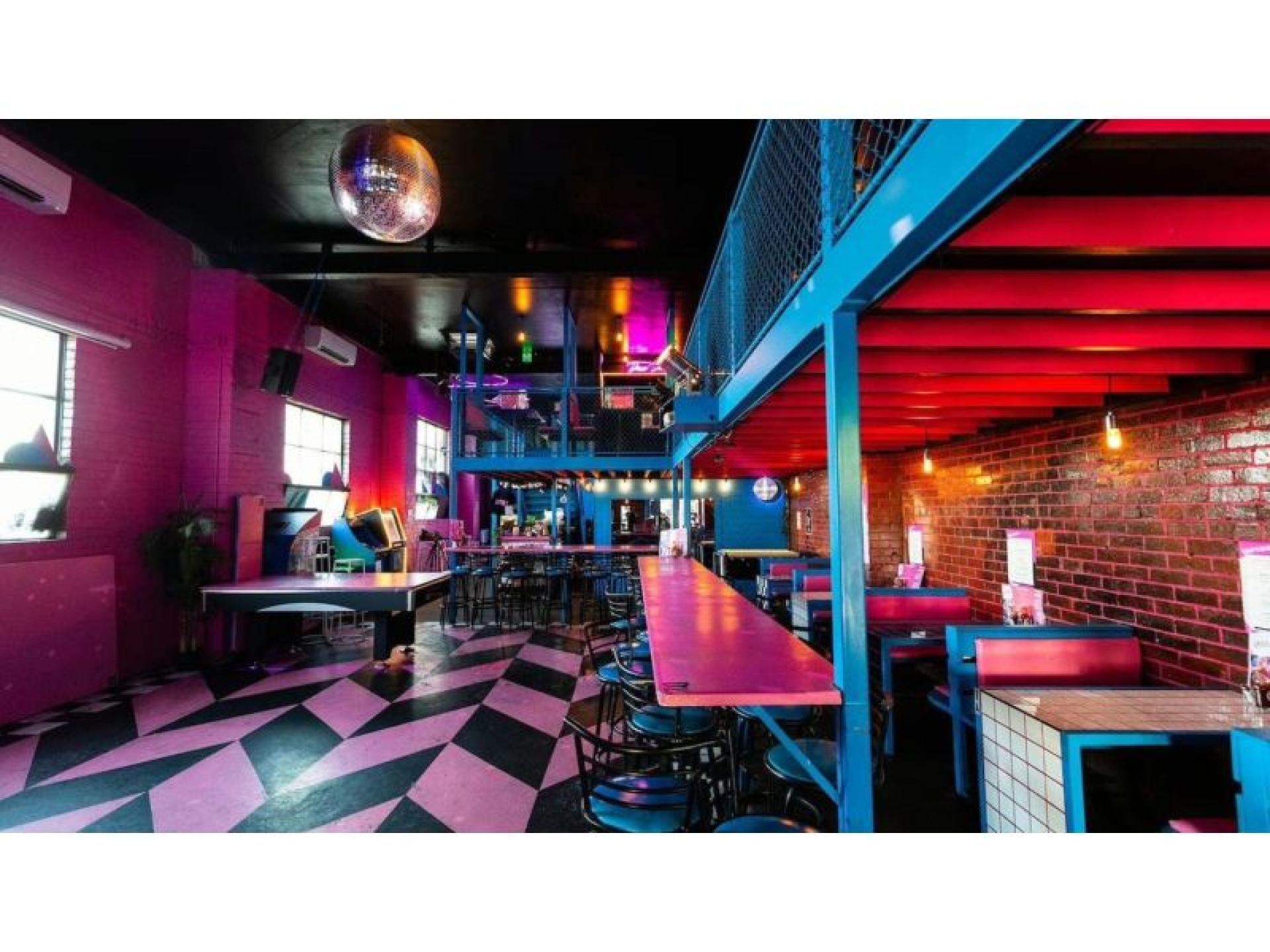 The prominent corner site is instantly recognisable, with the interior and exterior drenched in classic 80s bubblegum pink and cobalt blue. Footpath trading is available at the front of the venue, adding to its street presence and casual dining appeal. Inside, booth seating lines the walls surrounding a central dance floor, creating a flexible layout suited to both dining and late-night trade. Multiple retro arcade games (set to free play) and a pool table enhance the venue's entertainment offering. The main bar is positioned at the rear and leads through to a fully equipped commercial kitchen. Upstairs, a mezzanine level provides additional booth seating around the perimeter, along with a secondary bar, storeroom and walk-in cool room. A rear courtyard connects to the amenities and offers further operational flexibility.