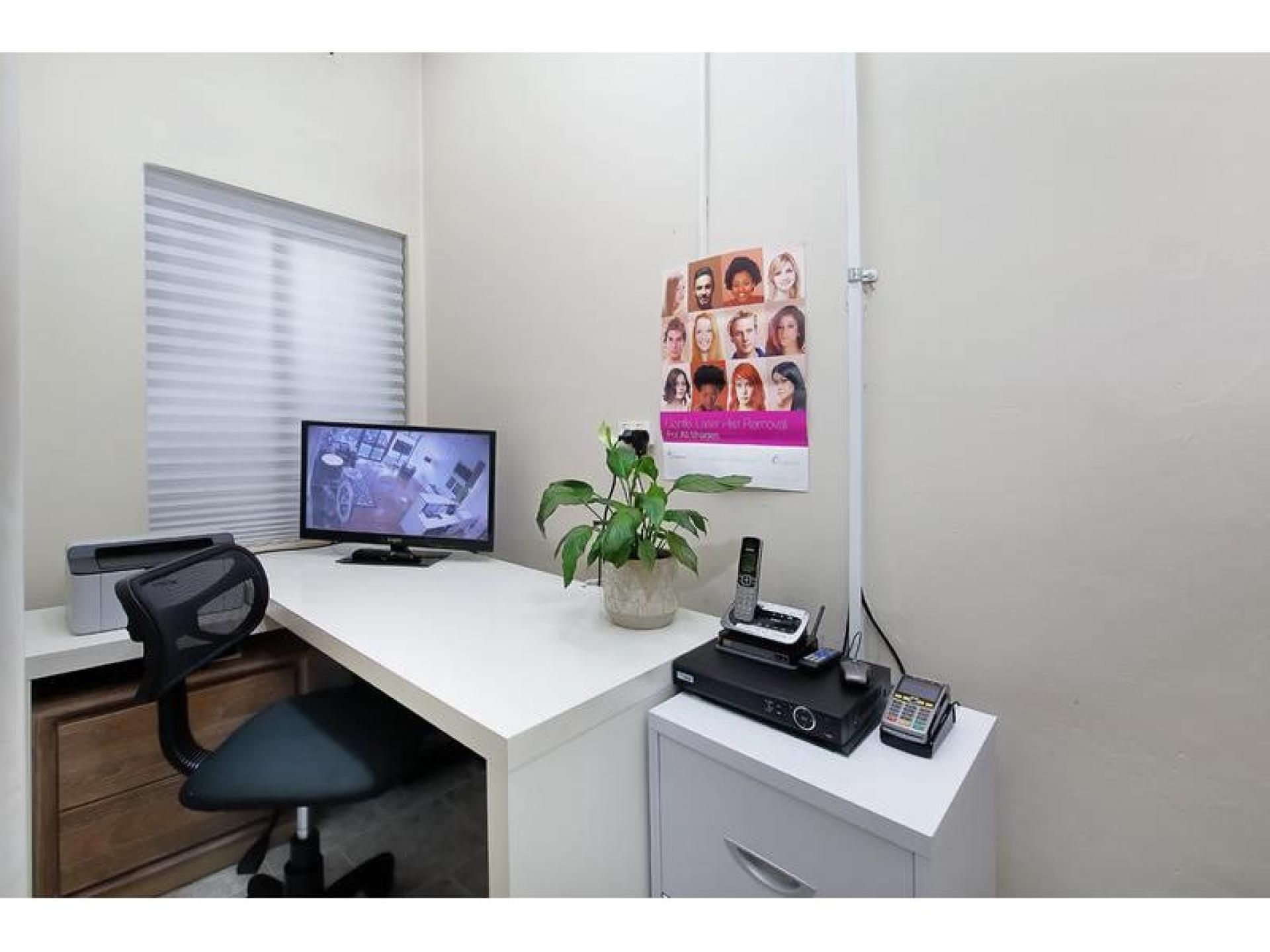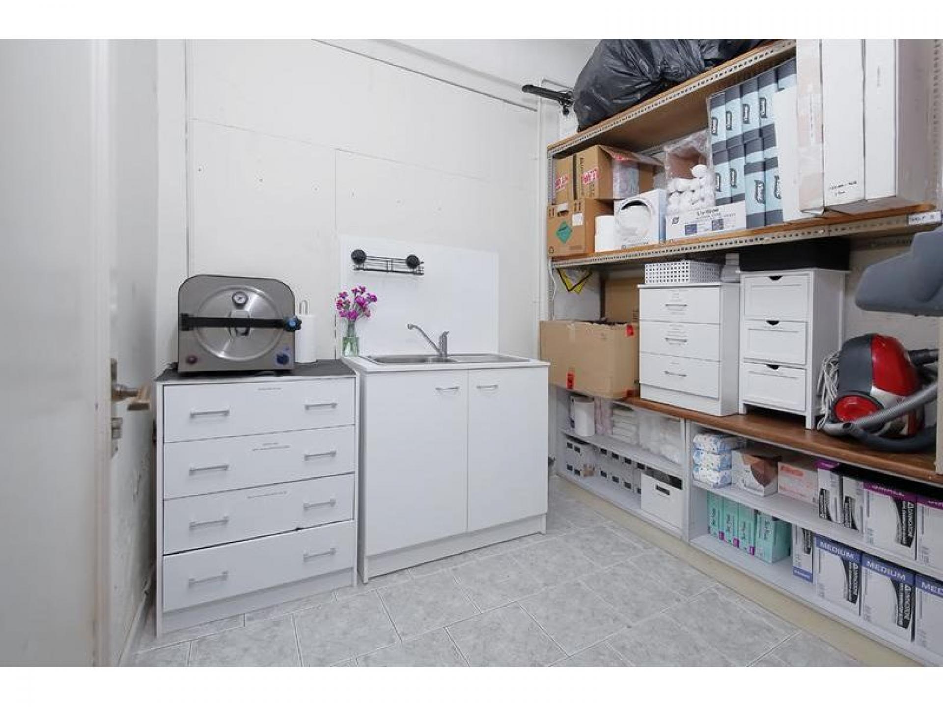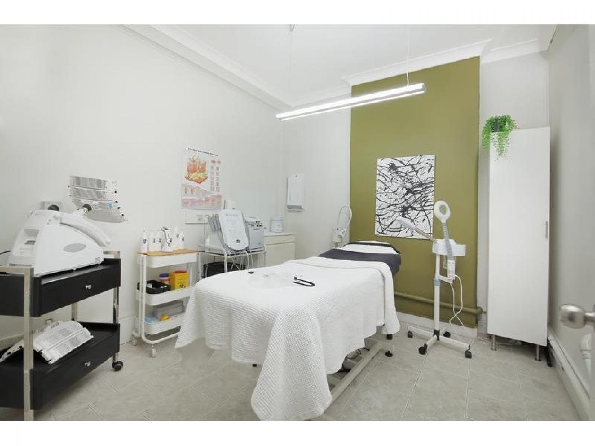 •3 air-conditioned treatment rooms, equipped with electric beds, sink and cabinetry, plus an office, kitchenette (with washing machine and dryer), storeroom and bathroom