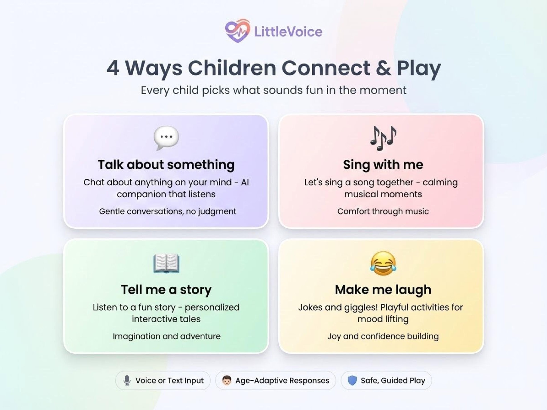 LittleVoice is an AI-powered emotional expression platform where children ages 4-12 can safely explore feelings through conversations, stories, songs, and play—while parents gain insights without invading privacy.